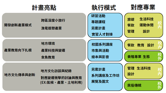 ●計畫在執行面上預期達到三個面向的發展,包含:1.開發創新產業模 式,其中一為跨區的深度小旅行,二為漁電共生遊憩活動機會發展。2.產業教育向下扎根,以活動企劃及講座方式推廣在地養殖或捕撈產業的知 識。3.地方文化傳承與創新,傳承場域現有文化,讓地方不僅有產業,且 能承先啟後、鑒往知來,面對未來環境變遷之挑戰。